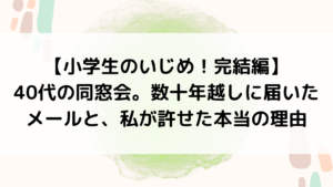 こんにちは。前回まで①~③では、いじめられた経緯と、親と先生を交えた話し合い、そしてクラス中にその問題を提起し、いじめてきた子が私に謝る、というところまでお話ししました。